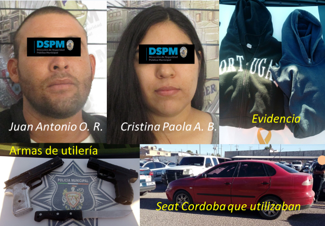 Chihuahua.- Una pareja presuntamente implicada en la comisión de varios robos con violencia contra de repartidores de mercancías en distintos puntos de la ciudad, fue detenida la tarde del martes por elementos de la Policía Municipal cuando fueron detectados a bordo de un automóvil y tenían en su poder dos armas en apariencia de fuego, un cuchillo y dos sudaderas con capucha supuestamente listos para asaltar a un distribuidor en calles de la colonia 20 Aniversario.
