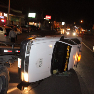 Chihuahua.- El conductor de un taxi del sitio "Aguilas"con placas 7224BWC, se impactó contra la rampa de una grúa que se encontraba haciendo maniobras en la Avenida Mirador, y quedó volcado sobre la cinta asfáltica hace unos momentos.